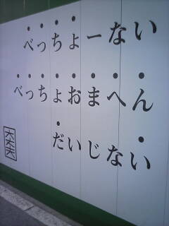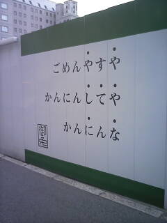 されます。 その工事現場の囲いフェンスにペイントされているのが『せんばことば』。 今の若者からすると『いったい何語?』という感じでしょう。 今から考えてみると、私の祖母がよく船場ことばを交えて喋って いた事を思い出し、ノスタルジーに浸っていました。 どこでって? このフェンスの真ん前にある『CAFE LUCA』で。 このカフェの2Fからフェンスの向こうが見えます。 たまには、こういう角度ででボーッと工事風景を見ると癒されます。 店内はいたってアメリカンテイストです。 そして正面は残念なことにこのせんばフェンスです。 2009年まで耐えてください。 PR |
