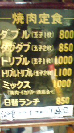 メタボレポーターが、またまた懲りずにボリューム満点の 看板に誘われてお店に入りました。 ここで、飛び交う声は・・。 『ダブダブで。』『トリトリで。』 なんじゃそれ? すかさず、店のオバチャンに訊ねた。 『何がオススメ?』 オバチャン:『ダブダブかな。』 『何それ?』 『メニューの名前違うで、量のことやで。』 なるほど、すなわち、それらの意味は。 焼肉1/玉子1=ダブル 焼肉1/玉子2=ダブダブ 焼肉2/玉子1=トリプル 焼肉2/玉子2=トリプルトリプル 私はダブダブにしました。(正直トリトリと迷いましたが) しかも、ありがたい事に、メタボ野郎には堪らない、 ご飯はオヒツで食べ放題。 そして、偶然カウンターで隣に合わせた中年男性は『船場らへん』を 持っていました。 そこにもメタボ系中年には堪らない情報が載っていることを 彼はまだ知らない。 そうそう、豚汁も付いてます。 PR |